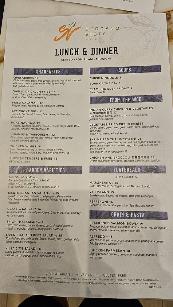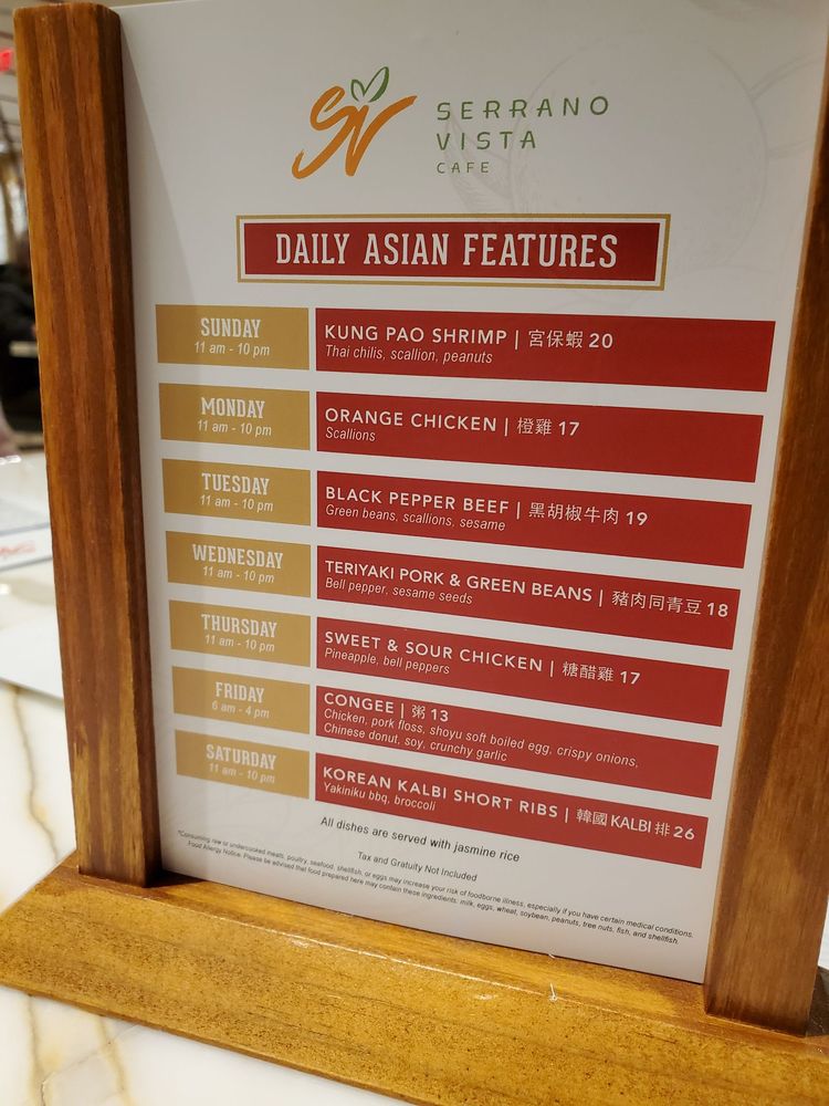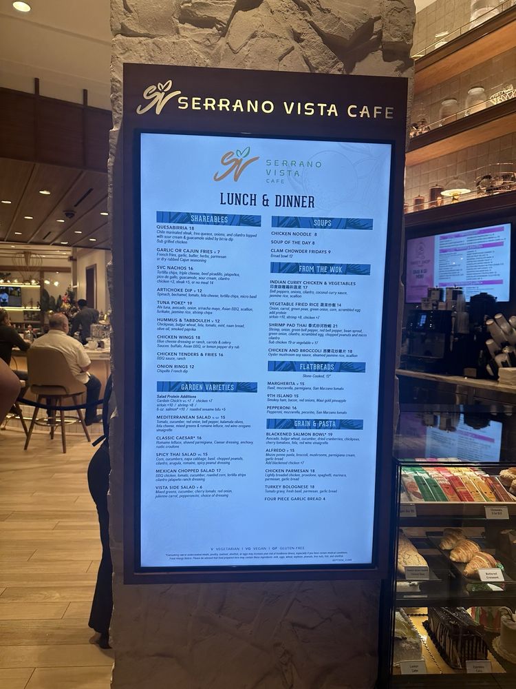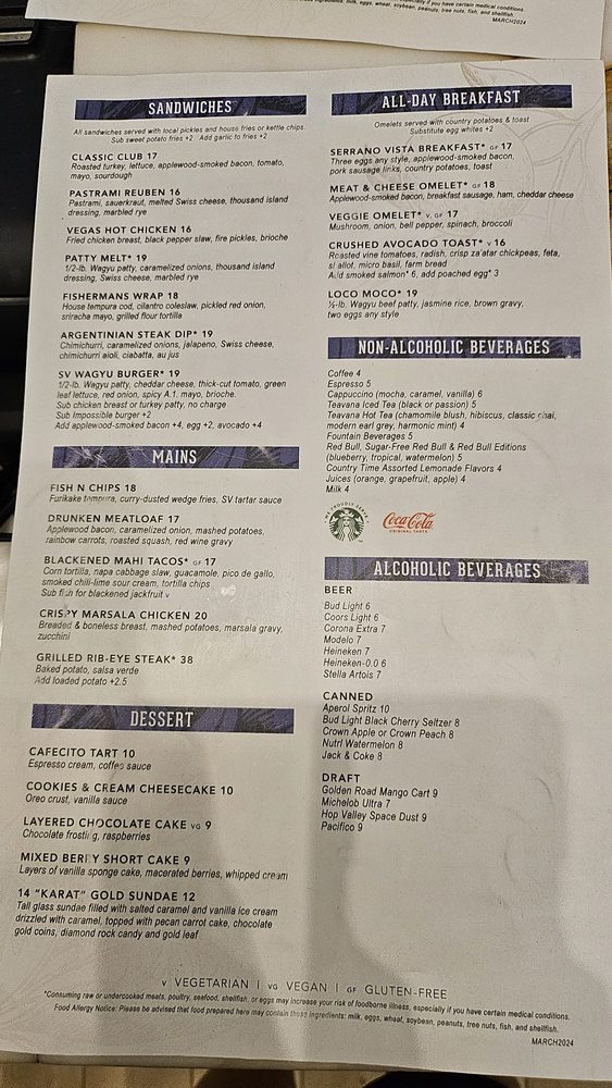 Introducing the menu at Serrano Vista Café, located at 4321 W Flamingo Rd in Las Vegas, NV. This casual and touristy spot offers a wide range of options including American cuisine and bar favorites. The menu features many vegetarian options, making it a great choice for groups with diverse dietary preferences. With waiter service, a full bar, and outdoor seating options including heated and covered areas, Serrano Vista Café provides a comfortable and enjoyable dining experience. The café also offers amenities such as free Wi-Fi, TV, and drive-thru service, catering to various dining preferences. With garage and private lot parking available, convenience is a priority for guests. Enjoy a night out on Wednesday or Thursday and experience the flavors and atmosphere of Serrano Vista Café.